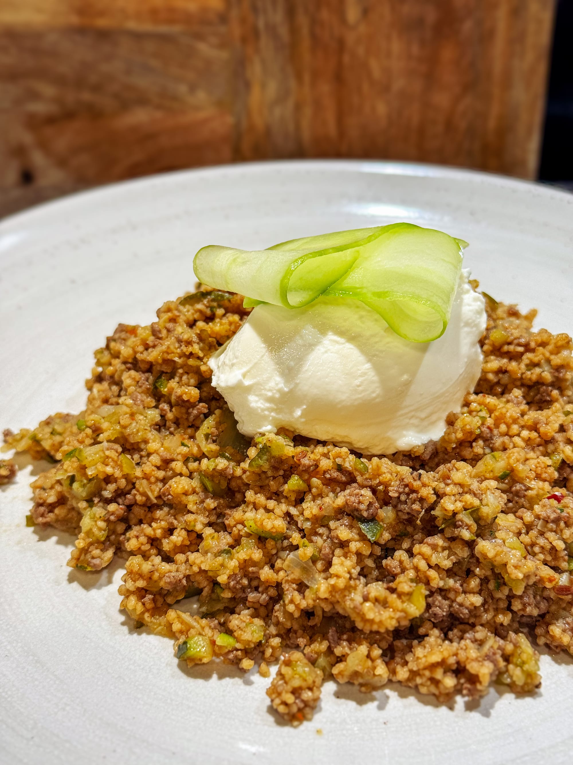 Fold the beef mixture through the couscous (or serve it spooned on top). Garnish with cucumber ribbons and Greek yogurt if using.